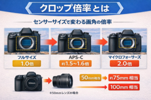 クロップ倍率とは、フルサイズセンサーを基準にして、どれくらい画角が狭くなるかを示したものです。